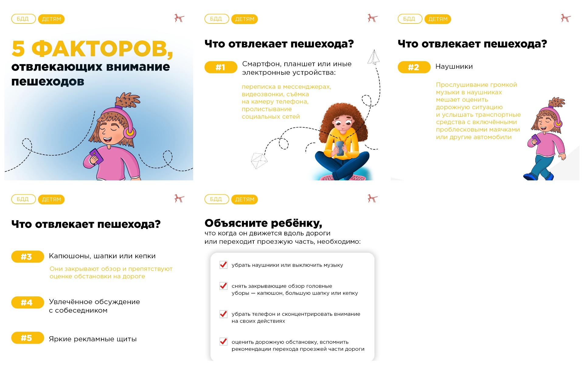 Детей необходимо приучать при переходе проезжей части пользоваться только пешеходным переходом, перед выходом на проезжую часть убедиться в собственной безопасности, никогда не перебегать проезжую часть, не пользоваться на дороге телефонами или другими гаджетами, не слушать музыку в наушниках, убирать зонт и снимать капюшон.